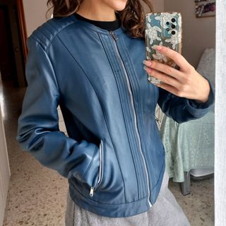 Cazadora polipiel azul. La talla real es una M - Cierre de cremallera frontal. - Bolsillos laterales con cremallera.