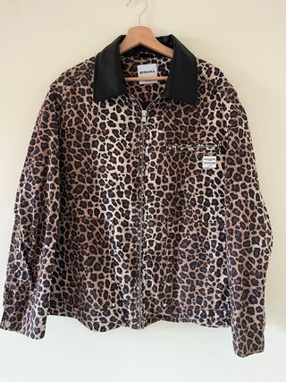 Cazadora de polipiel con un diseño llamativo y lleno de color. Presenta múltiples estampados y detalles gráficos. - Estampado de leopardo. - Detalles de tachuelas metálicas. - Cierre de cremallera. - Cuello con solapas.