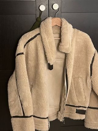 Abrigo de pelo sintético de Zara, talla S, en muy buen estado. Es suave, calentito y perfecto para el invierno. Diseño tipo biker con cierres metálicos y cremallera asimétrica, que le da un toque moderno y estiloso. • Color: marrón oscuro (muy combinable) • Tejido suave y agradable • Corte recto y cómodo • Cremalleras delanteras funcionales • Forro interior en perfecto estado (restaurado) El tejido interno de la cremallera de las mangas y los bolsillos es de polipiel y está algo desgastado debido al uso. Ver última imagen. Por lo demás está perfecto. Ideal para looks casuales o más arreglados. Usado muy poco y bien cuidado.