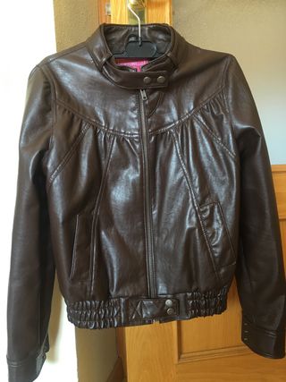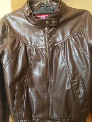 Cazadora de polipiel en color marrón. Precio de venta actual en tienda 69,99 euros, verificado a enero 2026. - Cuello redondo con cierre de botón. - Cierre de cremallera frontal. - Dos bolsillos en el pecho con solapa y botón. - Dos bolsillos laterales con cremallera. - Detalle de hombreras con botón. - En perfecto estado.