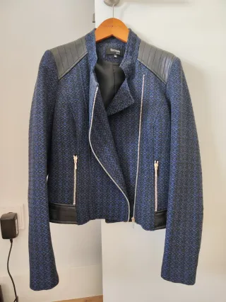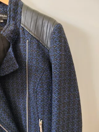 Cazadora de vestir con un diseño moderno y elegante. - Tejido con estampado geométrico en azul y negro. - Detalles en polipiel en hombros y bajo. - Cremallera frontal asimétrica. - Bolsillos laterales con cremallera.