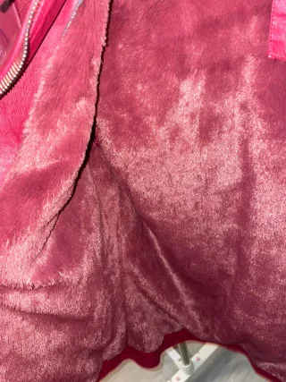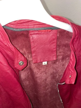 Cazadora efecto piel Roja, muy buen tacto, viene forrada, cremalleras en puños, es entallada,Es XL, pero equivale a una talla 38
