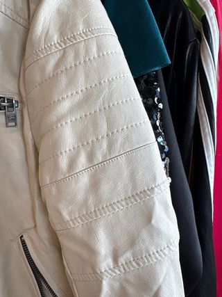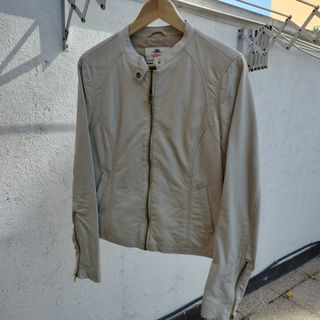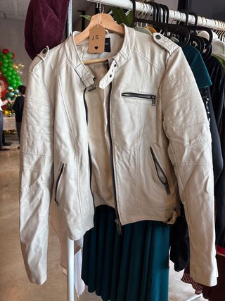 Preciosa cazadora de polipiel de la marca Only. Es de color beige y talla M (equivalente a 38 o 10). Está en muy buen estado. - Diseño de chaqueta motera. - Cierre de cremallera. - Bolsillos con cremallera.