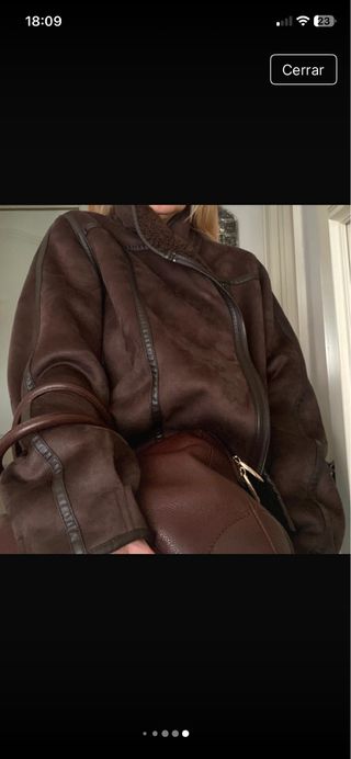 Cazadora estilo aviador de Zara con acabado efecto ante. - Diseño con forro interior de pelo. - Cierre de cremallera asimétrica. - Detalle de cinturón con hebilla. - Cuello alto con doble hebilla. - Puños y bajo con detalle de pelo. - Ribetes en polipiel. - Talla S, pero talla grande, yo normalmente uso.la M - 40