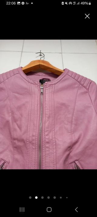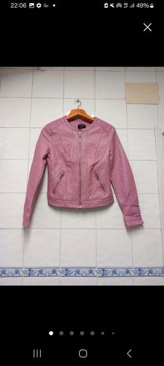 Cazadora Polipiel de color maquillaje rosita. Bolsillos con cremallera, al igual que en los puños también llevan cremallera. Apenas usada. Talla S