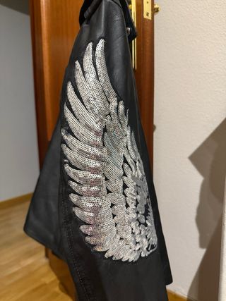 Cazadora estilo biker con un diseño único. - Polipiel de alta calidad. - Detalles de alas con lentejuelas plateadas y rosas en las mangas. - Cremalleras plateadas. - Cuello solapa con botones a presión.