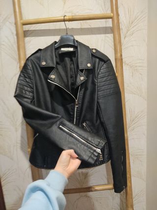 Cazadora negra de polipiel de Bershka. Talla S pero talla como una M. Desgastada en el cuello como se ve en la fotos.