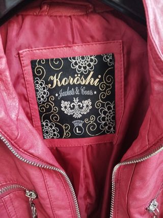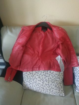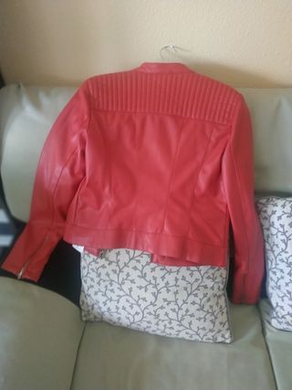 Chaqueta de polipiel rojo fresa, talla L Con bolsillos de cremallera y detalles bordados en las mangas. Como nueva, muy poco uso