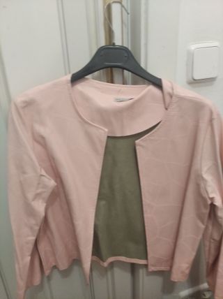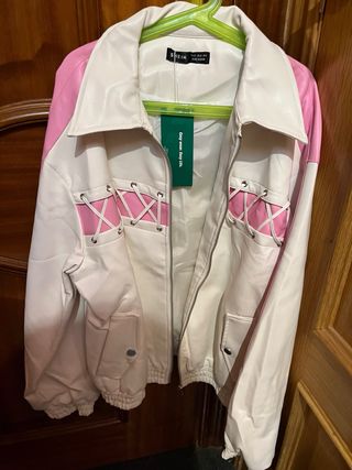 Cazadora fina de polipiel rosa talla s como nueva salvo por un rasguño de menos de 3 mm en el hombro, ver fotos