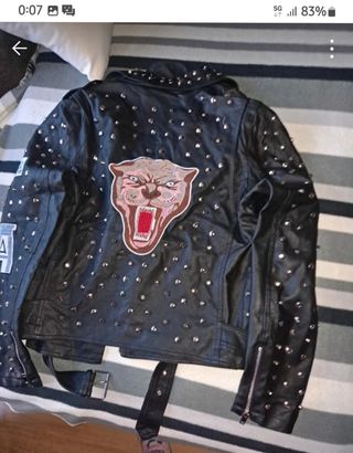 Cazadora de polipiel con un llamativo diseño de graffiti. - Estilo motero. - Cierre de cremallera frontal. - Bolsillos con cremallera. - Se puede llevar también con cinturón. Se incluye. - Talla S/M. Es amplia.