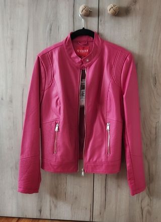 Cazadora polipiel Guess, fuxia, talla M. Nueva. Tiene un ligero roce en un lateral, casi no se nota, pasa desapercibido, tal y como se aprecia en la última fotografía, por eso se ha rebajado.
