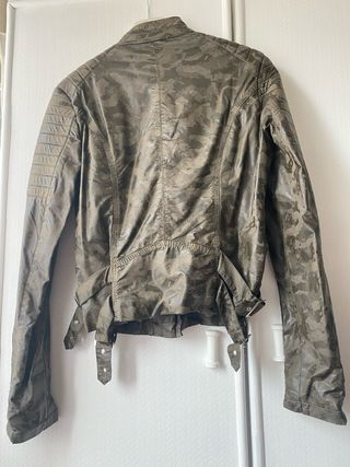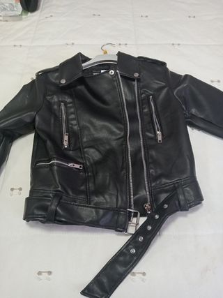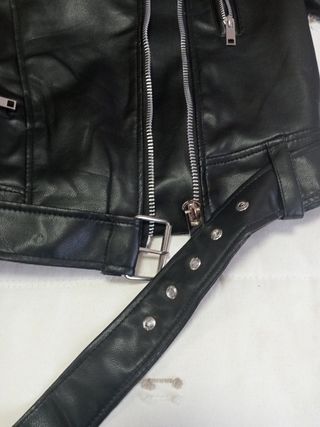 Cazadora estilo motero confeccionada en polipiel. - Diseño con cremalleras plateadas. - Solapas de solapa. - Cinturón ajustable en la cintura.