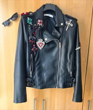 Chaqueta joya polipiel con pedrería en la parte delantera, la manga izquierda, laterales y espalda. Con dos bolsillos laterales. Adornada con cremalleras y hebillas. Cierre frontal con cremallera. Brillantes y perlas intactas. No le falta ninguna joya..como puedes ver en las fotos. Ligero defecto en cuello y mangas. Hay tips para arreglarlo. Puedes ponerle un cuello de pelito. O utilizar las joyas para customizar otra chaqueta. (son apliques que se pueden descoser) --Esta nueva salvo esos defectos -- ☆Publico fotos detalladas del articulo. No hago devoluciones. Si tienes alguna duda, preguntame antes de comprar.