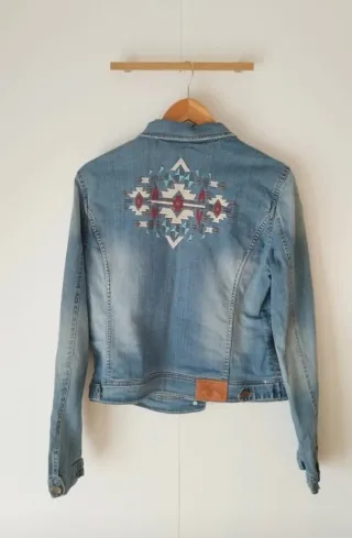 Cazadora vaquera de estilo clásico con un toque distintivo. - Diseño con bordados en la zona trasera. - Cierre de botones metálicos. - Bolsillos con solapa en el pecho.
