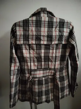 Cazadora fina con un diseño de cuadros clásico y moderno. - Estampado de cuadros en blanco, negro y rojo. - Cierre de doble botonadura. - Bolsillos frontales. - Cinturón a juego.