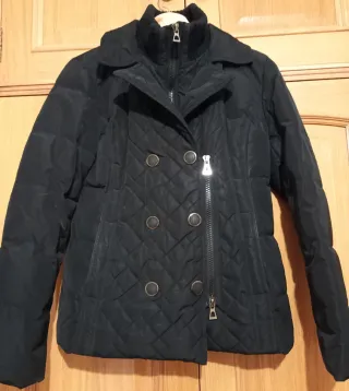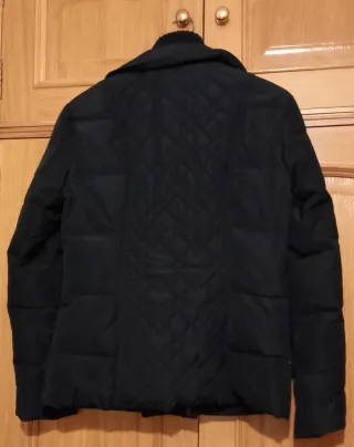 Cazadora de mujer con relleno de 80% de plumón. Color negro. Diseño acolchado con doble fila de botones. Talla M. Doble cremallera (foto 3) muy útil con bajas temperaturas. Cuello de lana. Bolsillo interior con botón y dos bolsillos exteriores. - Cierre de cremallera doble - Cuello alto.