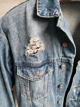 Cazadora vaquera con un diseño moderno y desgastado. - Estilo desgastado con rotos. - Cierre de botones metálicos. - Dos bolsillos en el pecho y dos abajo. - Medidas: Ancho 52 cm y largo( desde la mitad del hombro) 57cm. - Se puso un par de veces