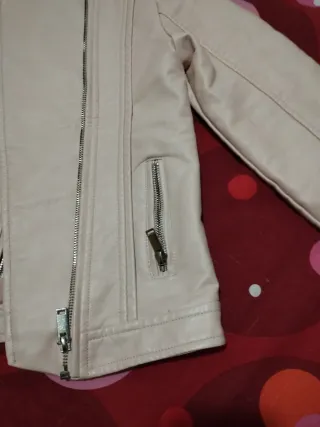 Cazadora de piel sintética en color rosa, con un diseño moderno y detalles de cremalleras. - Cierre principal con cremallera. - Dos bolsillos frontales con cremallera. - Cremalleras decorativas en los puños. - Cuello estilo motorista.