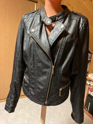 Cazadora biker polipiel de mujer Violeta by Mango, talla L (equivale a una 46) Usada solo una vez. Medidas: - Pecho 59 cm - Cintura 57 cm - Largo 63 cm - Ancho de hombros 46 cm - Largo de manga 60 cm Envío disponible. Entrega en mano SOLO en Azuqueca.
