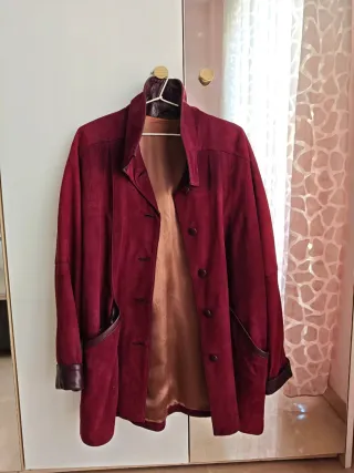 Elegante abrigo de piel para mujer. - Material: 100% piel. - Color: Rojo con detalles en marrón. - Diseño tipo parka o cazadora.