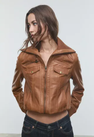 Cazadora de piel para mujer con un diseño moderno y elegante. Perfecta para añadir un toque de estilo a cualquier conjunto. - Cuello alto con detalle de canalé. - Cierre de cremallera. - Múltiples bolsillos frontales con solapa y botón. - Detalle de costuras marcadas.