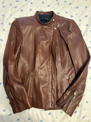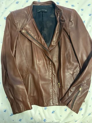 Cazadora de cuero de la marca Zara. - Diseño moderno y elegante. - Cierre asimétrico con cremallera. - Cuello mao. - Puños con cremallera.