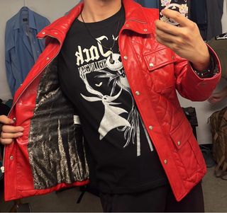Cazadora estilo motero de piel en color rojo. - Diseño acolchado en hombros y mangas. - Cierre de cremallera. - Bolsillos frontales con cremallera. - Puños ajustables con botón.