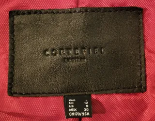Cazadora de piel para mujer, con un diseño clásico y moderno. - Forro interior de color rojo vibrante. - Cierre frontal con cremallera. - Bolsillos laterales con cremallera. - Detalle de solapas y botones metálicos. Etiqueta co talla L corresponde a una talla 44