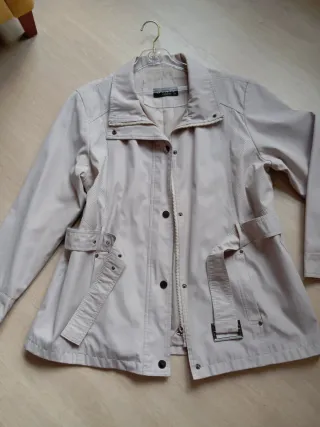 Cazadora o gabardina de la marca Fénix con bolsillos, forrada. Pone talla 42 pero da para una 46 que es la mia - Diseño elegante en color beige. - Talla XL (equivalente a 42/14). - Detalle de cinturón ajustable en la cintura. - Acabado con perforaciones sutiles en los laterales. - Doble cierre con cremallera y automáticos.