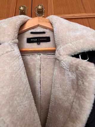 Cazadora de Zara con forro interior de borreguito. - Cierre de cremallera. - Bolsillos frontales con cremallera. - Cinturón ajustable en la parte inferior. - Cuello con solapas y detalle de hebillas.