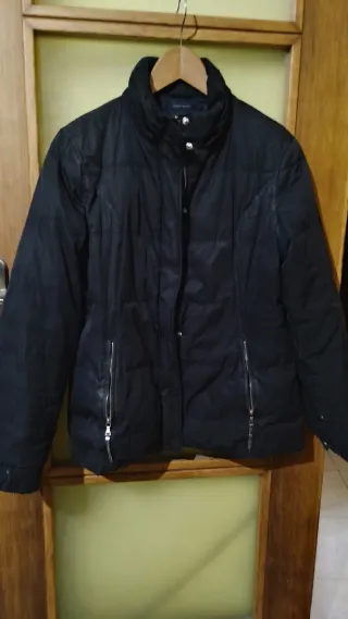 Cazadora acolchada de mujer, marca Inside, talla L, color negro. Cierre con cremallera y botones a presión, los bolsillos laterales llevan también botón a presión, . La capucha se puede recoger y formar el cuello de la chaqueta. Medidas: 85cm largo, 42 cm hombros y 50 cm axilas. Está usada pero en perfecto estado.
