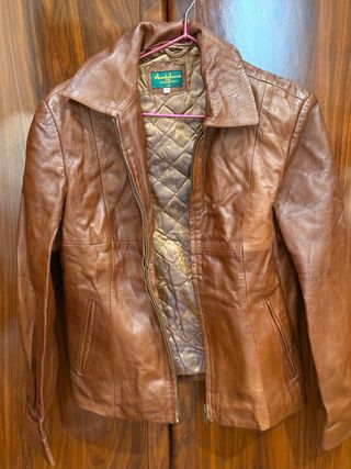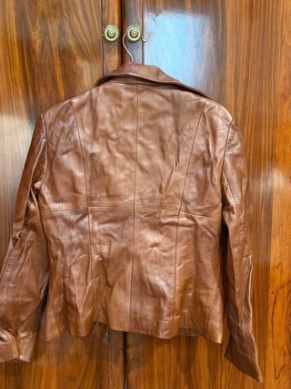 Cazadora de cuero para mujer, con un diseño clásico y elegante. - Material exterior: cuero genuino. - Forro interior acolchado. - Cierre de cremallera frontal. - Bolsillos laterales con cremallera. - Un pequeño desgaste abajo donde la cremallera , se aprecia en la fotografía aunque en realidad se nota mucho menos, la fotografía lo resalta muchisimo