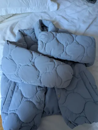 Cazadora acolchada de la marca Zara, con un diseño moderno y cinturón. - Color beige con detalles en marrón. - Capucha integrada. - Cierre de cremallera frontal. - Cinturón ajustable a la cintura.