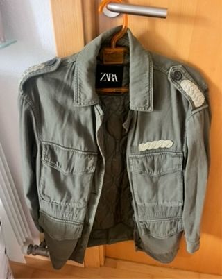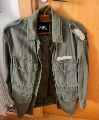 Cazadora estilo militar de la marca Zara. - Color verde militar. - Diseño con múltiples bolsillos delanteros. - Detalles de galones en hombros y pecho. - Forro interior acolchado.