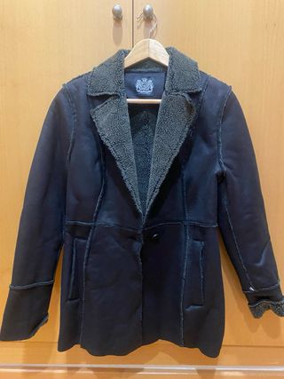 Cazadora color negro con pelo. Con desgaste en hombros. Talla: S Color: Negro. Marca: Javier Simorra.