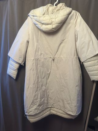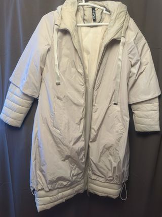 Cazadora larga con capucha y cremallera frontal. Diseño moderno y funcional. - Mangas con detalle acolchado. - Cordones ajustables en la capucha y el bajo. - Bolsillos frontales.