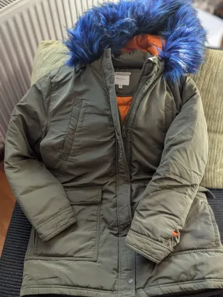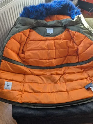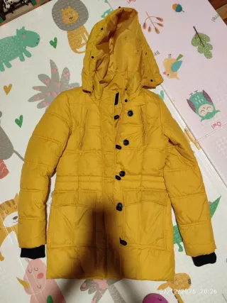 Cazadora tipo chaquetón acolchada con forro interior naranja. - larga 1,64 cm 14 años aprox - Cierre de cremallera. - Cuello con capucha desmontable