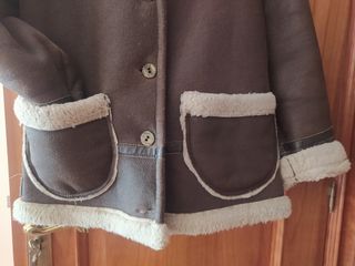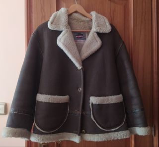 Cazadora color marrón chocolate con forro interior de borreguillo. Tiene cierre de botones y tiene 2 bolsillos delanteros. Cuello y puños con detalle de borreguillo. Tiene signos de desgaste que se ven las fotos.
