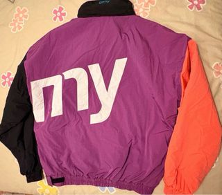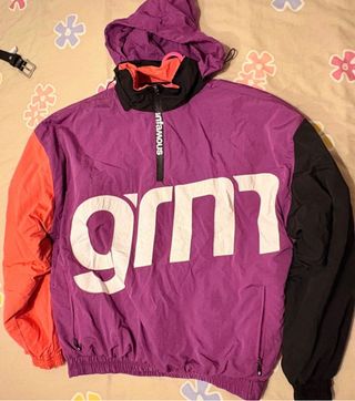 Cazadora de la marca Grimey con un diseño llamativo y moderno. - Diseño color block con paneles morados, naranjas y negros. - Logo grande de la marca en blanco en el frontal. - Capucha ajustable con cordones, se guarda. - Cremallera frontal parcial y bolsillos con cremallera.