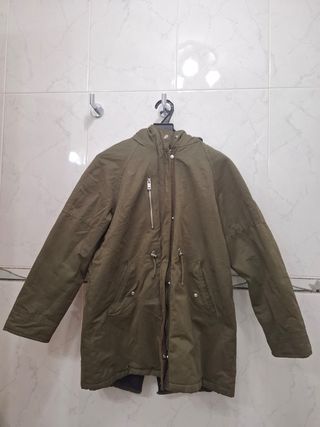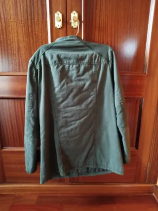 Cazadora estilo parka de Zara en color verde militar. Es una prenda versátil y cómoda. - Cierre con cremallera y botones. - Bolsillos frontales con solapa. - Cordón ajustable en la cintura. - Capucha con pelo. Poquísimo uso