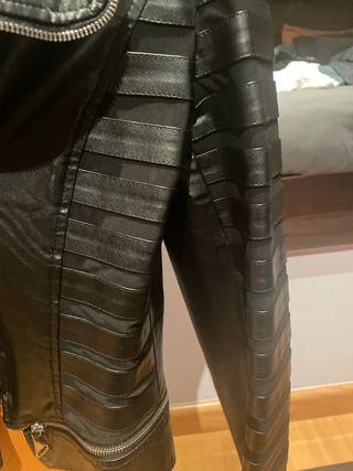 Cazadora de cuero de la marca Zara. - Diseño moderno con múltiples cremalleras. - Cuello con acabado de canalé. - Cremalleras en los puños.
