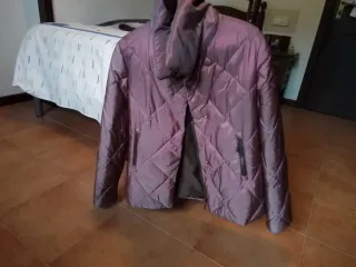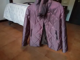 Cazadora acolchada con capucha de color burdeos/roja. Es una prenda cómoda y abrigada. Cierre de cremallera y botones.