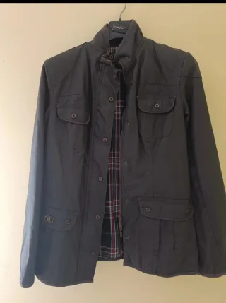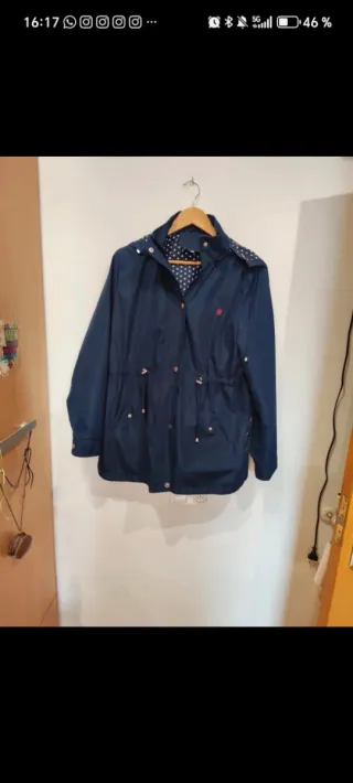 Cazadora azul con un diseño moderno y práctico. - Forro interior con estampado de lunares blancos. - Cierre de botones. - Cordón ajustable en la cintura. - Bolsillos frontales. - Bien cuidada pero un bolsillo roto hay que coserlo. Un pequeño enganche en la manga