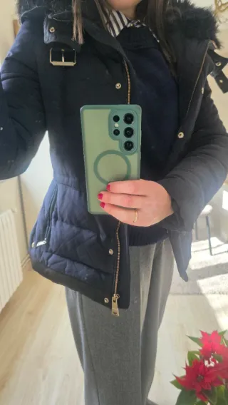 Cazadora larga de Zara con forro interior. - Cremallera rota, para llevarla abierta - Bolsillos frontales. - Capucha con forro de borreguito. Después está bien se ve en las fotos