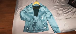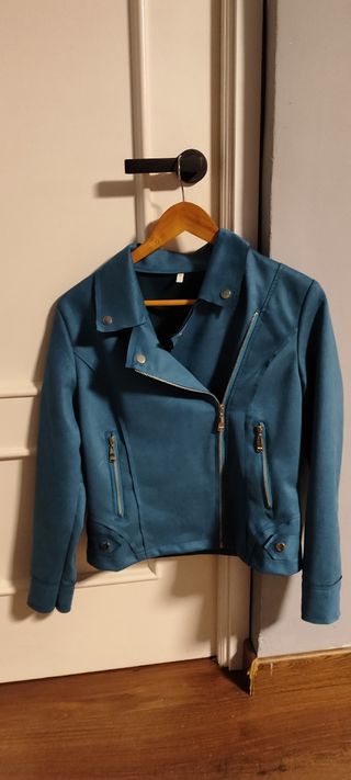 Cazadora biker de color verde azulado sin estrenar. Talla: S Tejido: antelina De entretiempo porque no tiene forro. Valorada en 37€ donde la compré (escuqui.com) La vendo porque no me vale y se me pasó la fecha de devolución :( Una pena porque es muy bonita