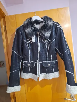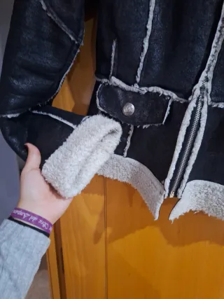 Cazadora de efecto piel con forro interior de borreguito. - Cuello con solapas y detalle de hebilla. - Cierre de cremallera. - Cinturón con hebilla en el bajo.