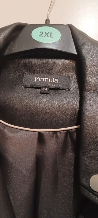Cazadora de polipiel entallada, con un diseño moderno y elegante.Tiene desgaste en el cuello por dentro. - Cuello redondo con cierre de botón. - Cremallera frontal. - Bolsillos laterales con cremallera. - Detalle acolchado en los hombros.
