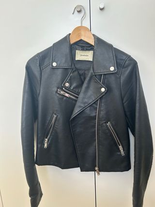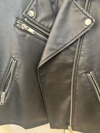 Cazadora estilo biker de Stradivarius. - Diseño asimétrico con cremalleras. - Cuello solapa con botones. - Puños con cremallera. Un poco desgastada, de ahí su precio