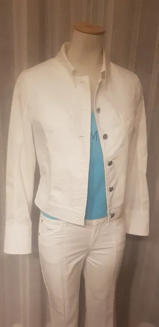 Favorecedor y cómodo conjunto de tres piezas Caramelo. - Cazadora blanca, talla como 38-40 - Pantalón blanco, talla como 36-38. - Camiseta turquesa, talla 38. Sólo venta en pedido mínimo de 60€