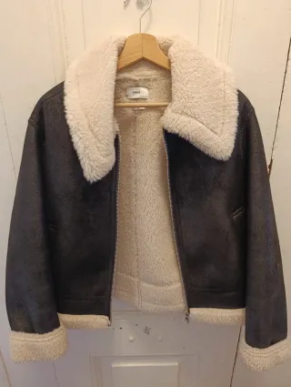 Cazadora corta con forro de borreguito. - Diseño moderno. - Cierre de cremallera. - Puños y cuello con detalle de borreguito. Usada.solo.un par de veces.zara.talla s